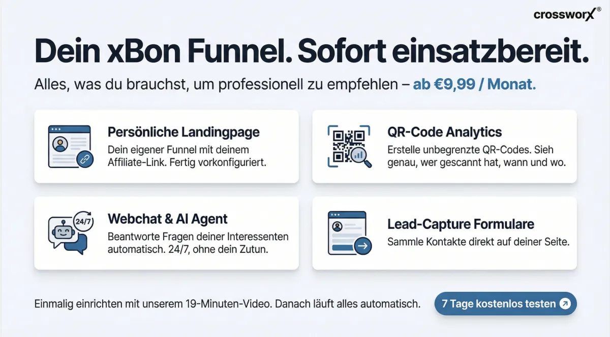 Der xBon Funnel ist eine fertige, konfigurierbare Landingpage für das Cashback-Programm. Du kannst hier deinen eigenen Link bzw. "xname" einsetzen und sofort teilen (z.B. durch die ebenfalls enthaltene QR-Code Funktion). Du benötigst lediglich eine eigene Domain/website oder kannst diese auch über die Plattform erwerben. Weiteres technisches Wissen wird nicht benötigt.